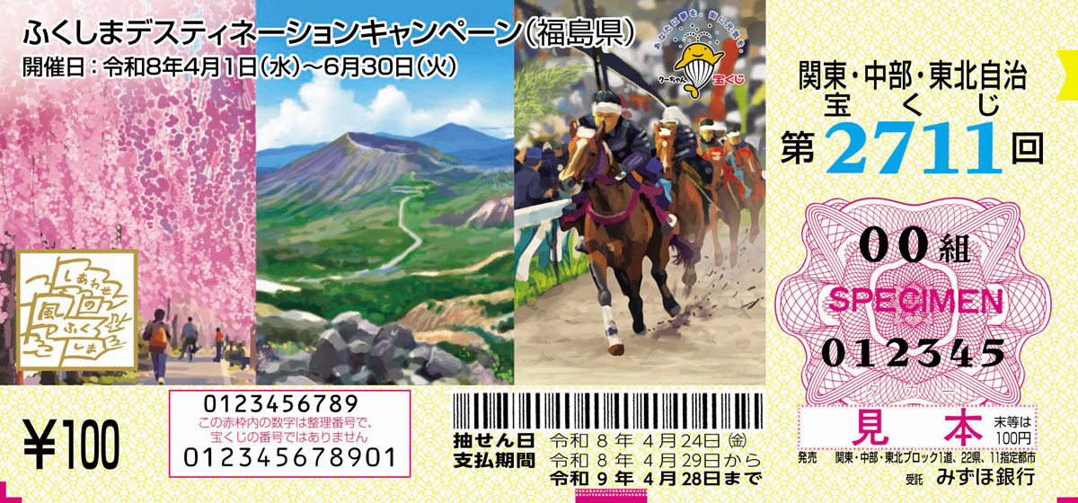 福島県は30日、第2711回関東・中部・東北自治宝くじの図柄に、大型観光企画「ふくしまデスティネーションキャンペーン」が採用されたと発表した。4月1日~21日に販売される。 吾妻山と相馬野馬追
